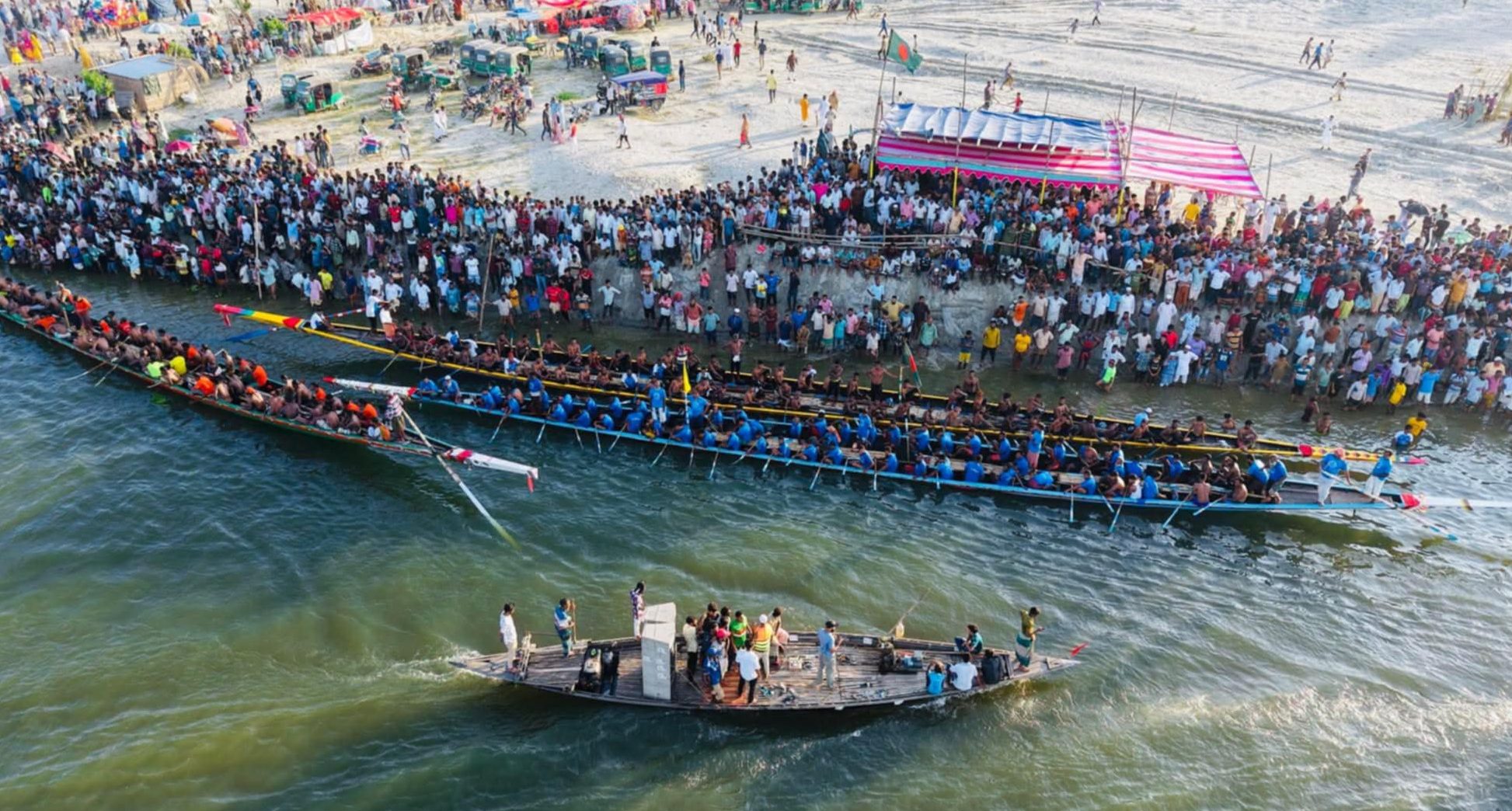 জারি-সারি গানের তালে ফুলজোড় নদীতে পানসী নৌকা বাইচ