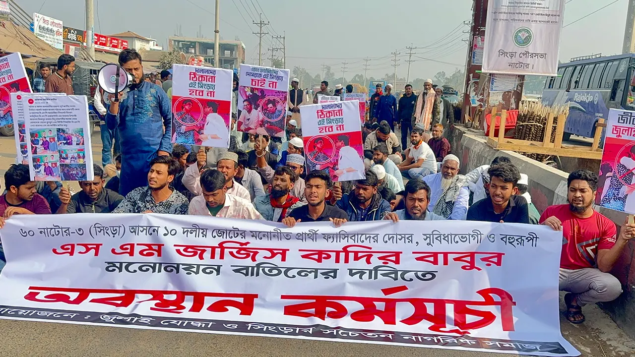 নাটোর-৩ (সিংড়া) আসনে ১০ দলীয় জোটভুক্ত ন্যাশনাল সিটিজেন পার্টির (এনসিপি) প্রার্থী পরিবর্তনের দাবিতে অবস্থান কর্মসূচি ও মহাসড়ক অবরোধ করেছে জুলাই