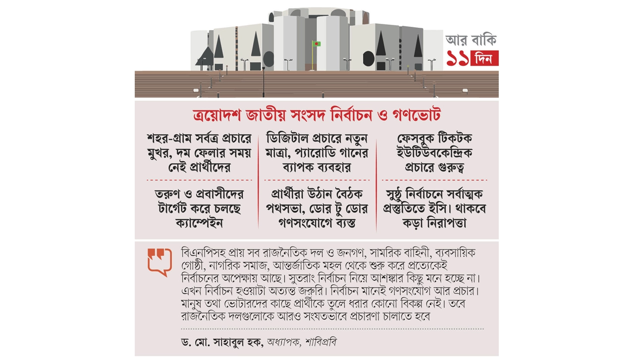 ত্রয়োদশ জাতীয় সংসদ নির্বাচনের ভোটগ্রহণের বাকি আর মাত্র ১১ দিন। প্রথমে শঙ্কা থাকলেও তপশিল ঘোষণার পরপরই পাল্টে যায় সারা দেশের