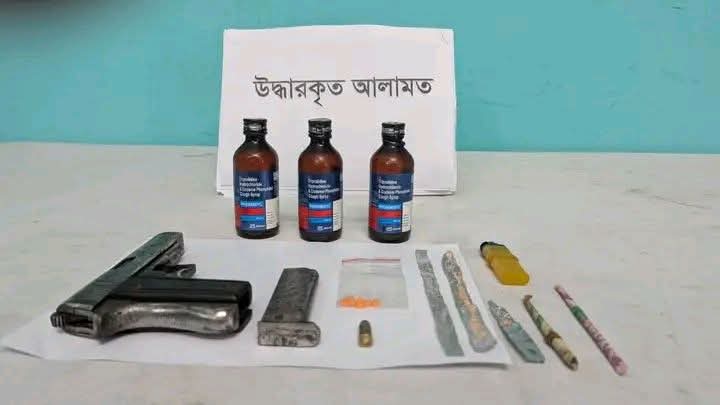 মুন্সিগঞ্জের শ্রীনগর থানা এলাকা হতে পরিত্যক্ত অবস্থায় একটি বিদেশী পিস্তল, একটি ম্যাগজিন, এক রাউন্ড গুলি, ০৩টি ফেন্সিডিলের বোতল ও ০৭