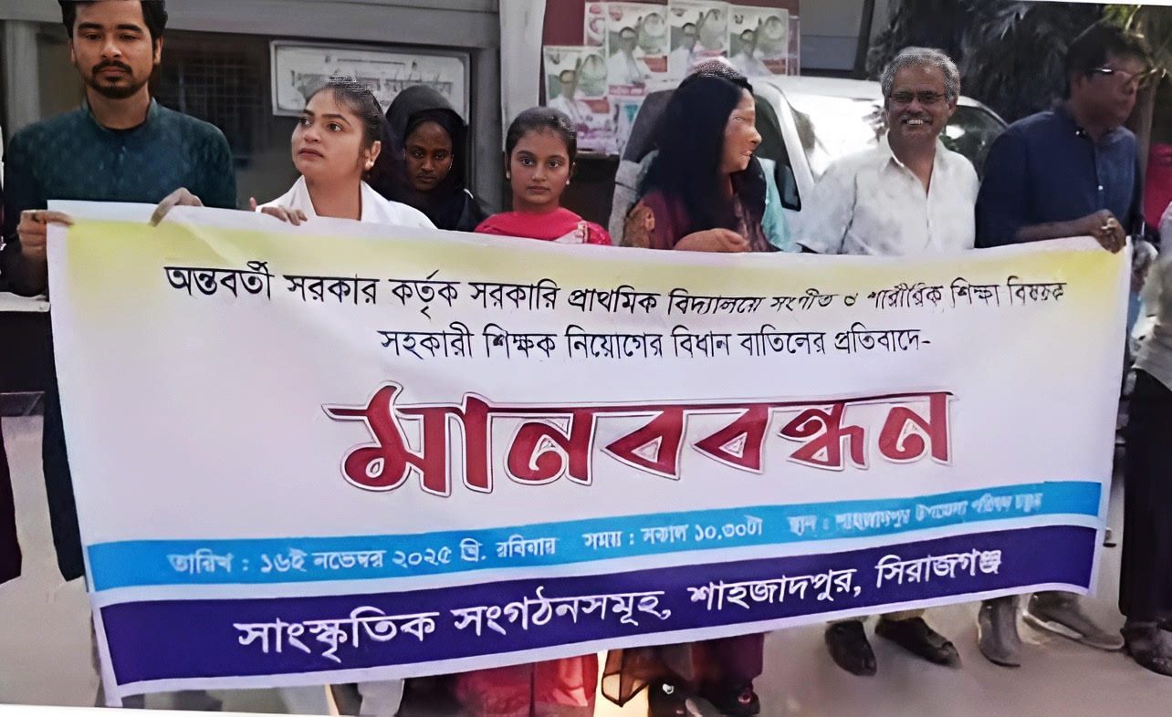 প্রাথমিক শিক্ষায় সংগীত ও শারীরিক শিক্ষা বিষয়ে শিক্ষক নিয়োগের পদ বাতিলের সিদ্ধান্ত প্রত্যাহারের দাবিতে সিরাজগঞ্জের শাহজাদপুরে মানববন্ধন ও প্রতিবাদ সমাবেশ