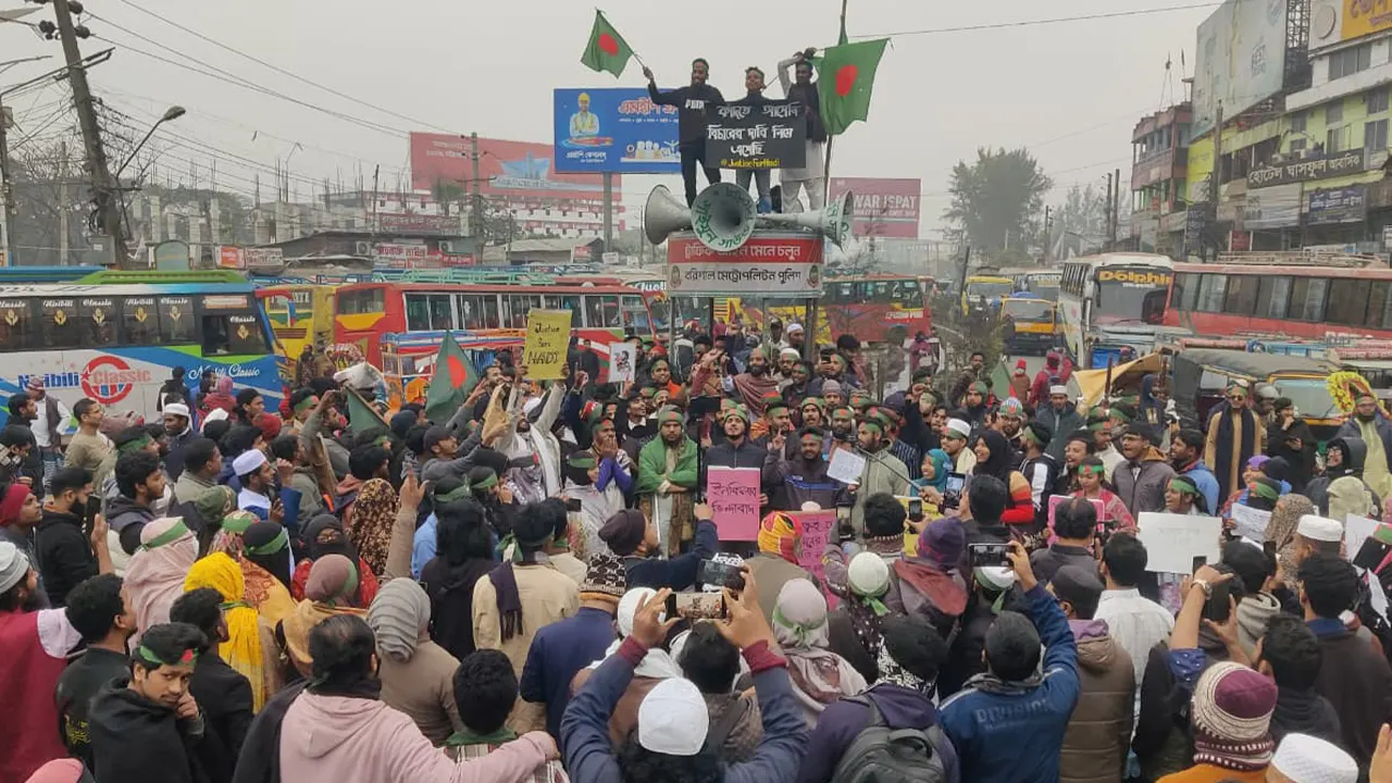 ইকনিলাব মঞ্চের মুখপাত্র শহীদ শরিফ ওসমান হাদির হত্যাকারীদের দ্রুত গ্রেপ্তারসহ বিচার দাবিতে বরিশাল-ঢাকা মহাসড়ক অবরোধ করেছে ছাত্র-জনতা। রোববার (২৮ ডিসেম্বর)