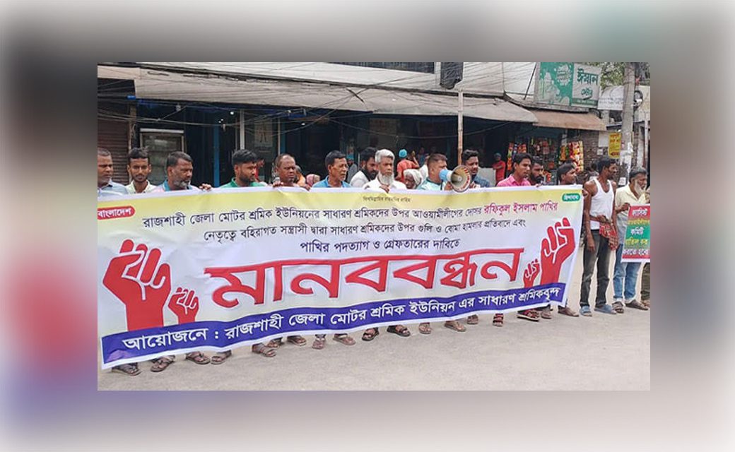 রাজশাহীতে ‘গুলি ও বোমা হামলা’র বিচার দাবিতে পরিবহন শ্রমিকদের মানববন্ধন