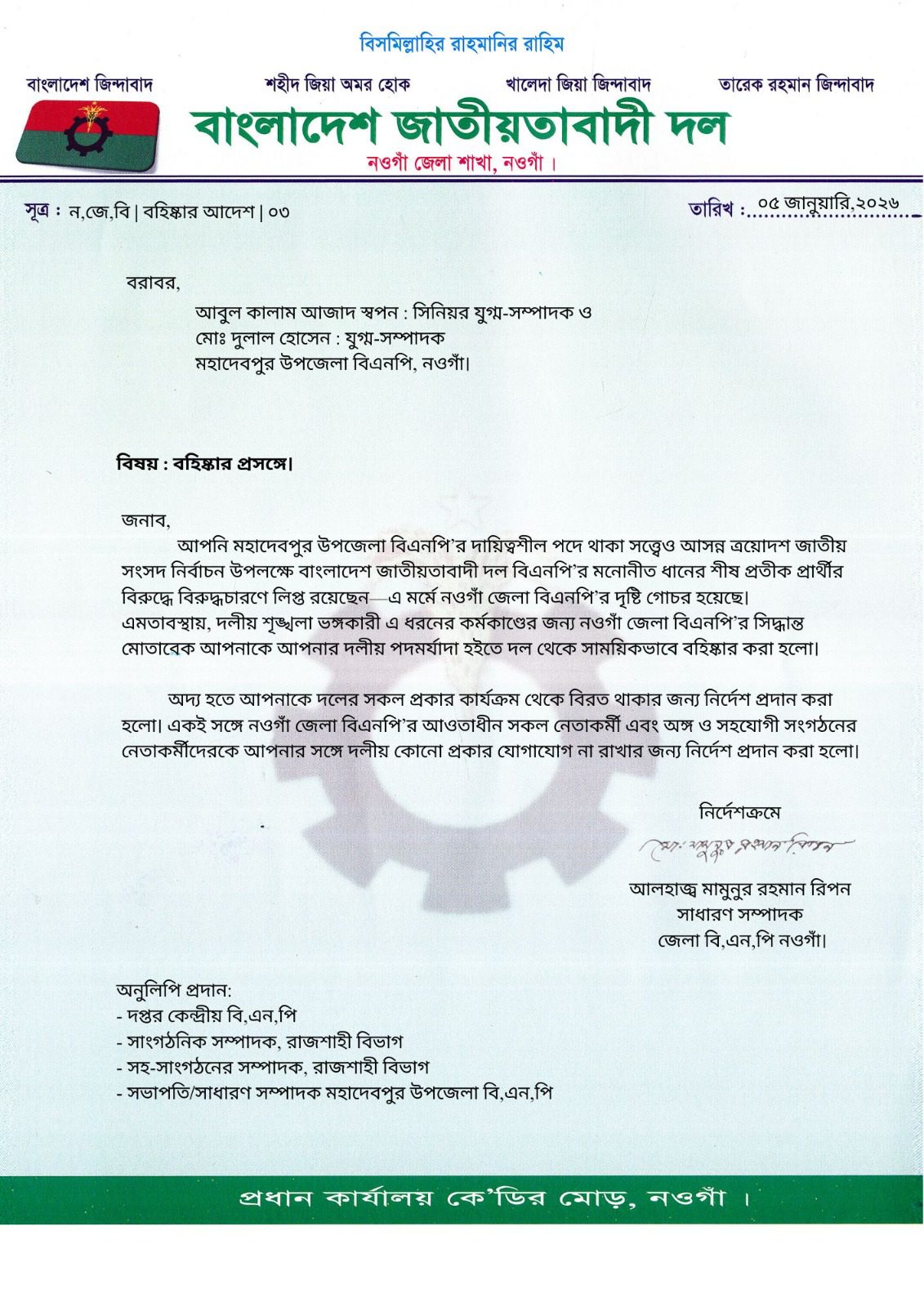 ধানের শীষের বিরুদ্ধে যাওয়ায় নওগাঁয় বিএনপির দুই নেতাকে বহিষ্কার