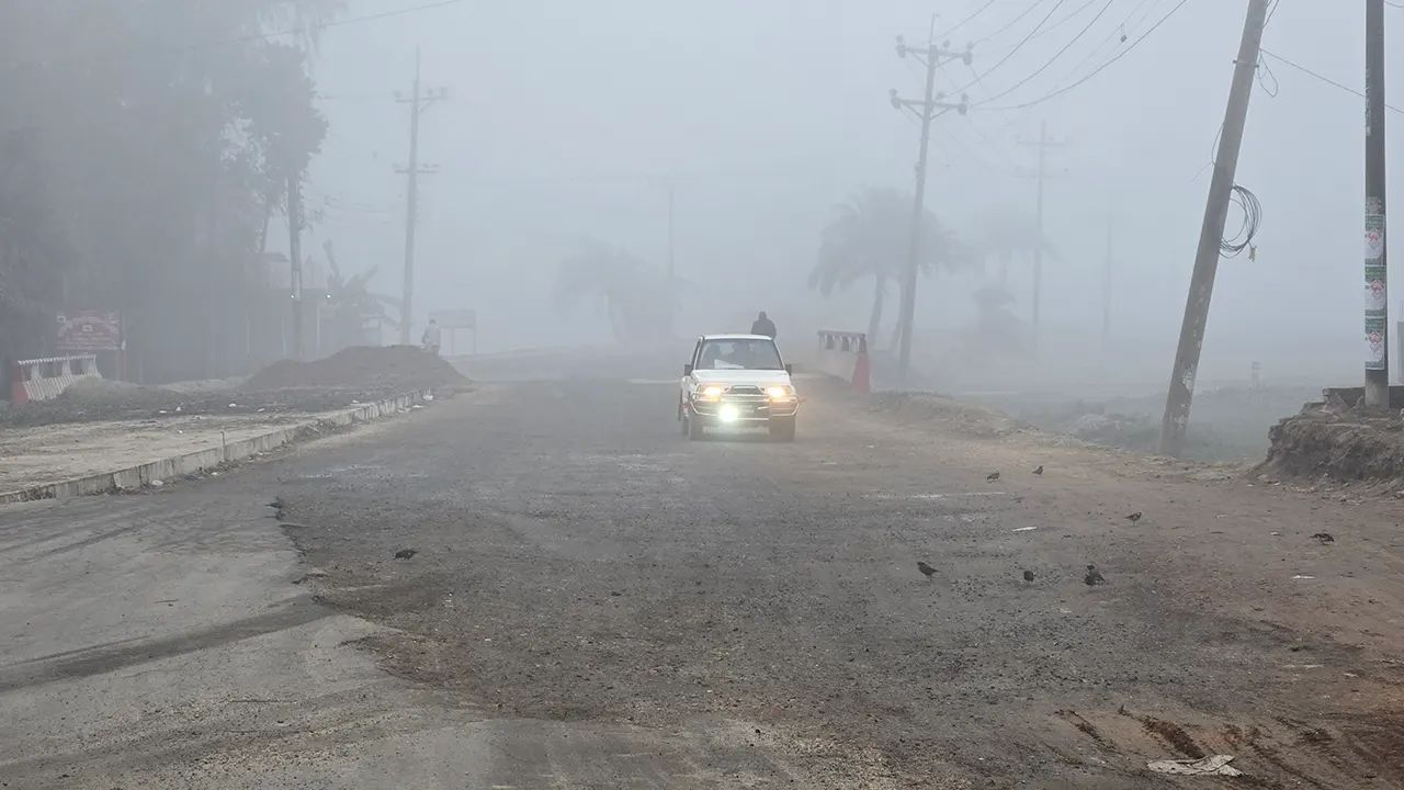নওগাঁয় দুদিনেও দেখা মেলেনি সূর্যের। সকাল পেরিয়ে দুপুরে হয়েছে। তবুও দেখা নেই আলোর। ফলে ঘন কুয়াশায় ঢেকে আছে চারদিক। ঝরছে