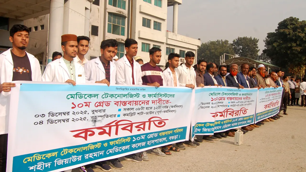চাকরি শুরুর সময় দশম গ্রেড কর্মকর্তার পদমর্যাদা বাস্তবায়নের দাবিতে বগুড়ায় একযোগে চার ঘণ্টার কর্মবিরতি পালন করেছেন মেডিকেল টেকনোলজিস্ট ও ফার্মাসিস্টরা।